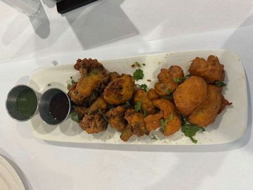Golden-fried broccoli and mushroom pakoras paired with warm, spiced masala tea